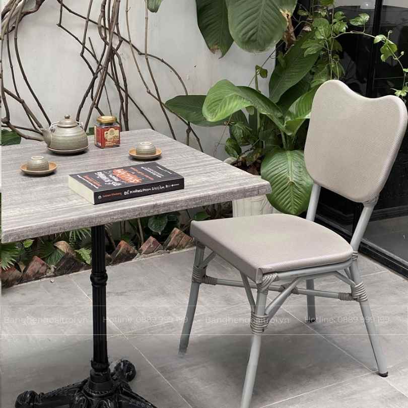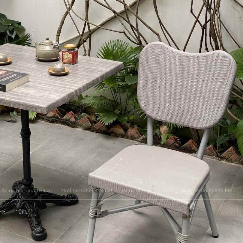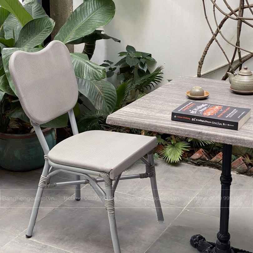 • Chất liệu ghế: Khung nhôm sơn tĩnh điện, mặt ngồi và lưng tựa lưới Textilene kháng nước