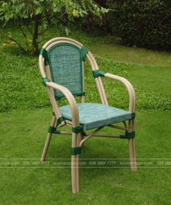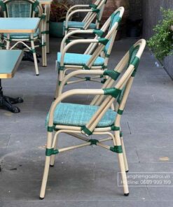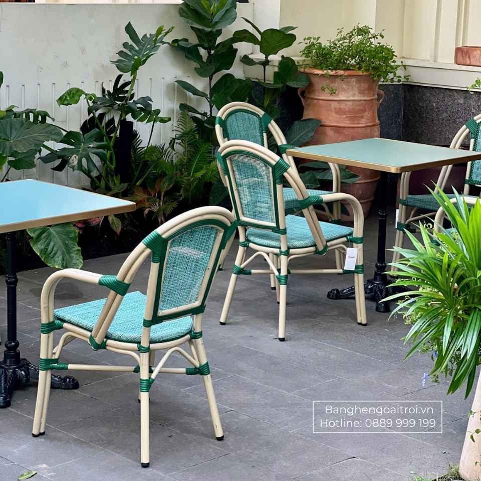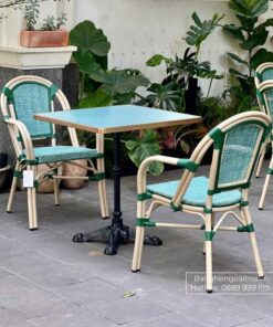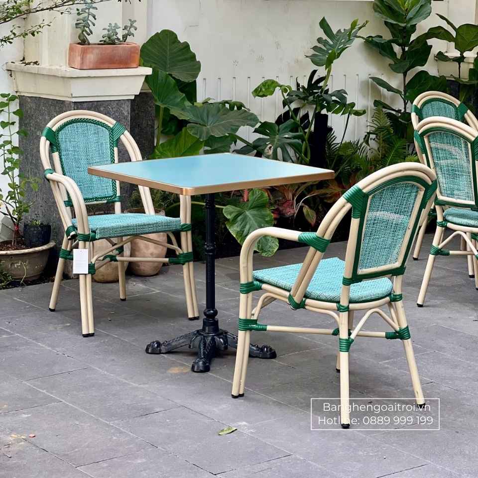 Điểm mạnh của bộ bàn ghế cafe ngoài trời này nằm ở khung nhôm sơn tĩnh điện, khả năng chống gỉ vượt trội và chịu được nắng mưa dài ngày. Ghế sử dụng lưới Textilene kháng nước, vừa thoáng khí, vừa mang lại cảm giác êm ái khi ngồi lâu. Mặt bàn nhôm sơn tĩnh điện màu xanh kết hợp viền mạ vàng tạo hiệu ứng thị giác sang trọng, rất phù hợp với các quán cafe phong cách châu Âu hoặc không gian nghỉ dưỡng.