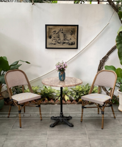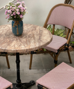 Bàn có chân nhôm đúc sơn tĩnh điện, giúp tạo nên độ bền và tính ổn định. Mặt bàn được phủ Resin, tạo ra bề mặt mịn màng, chống trầy xước và chống thấm nước, giúp bàn dễ dàng vệ sinh và duy trì vẻ đẹp trong thời gian dài.